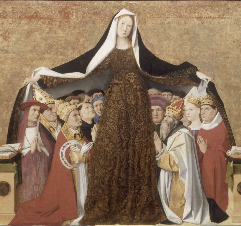 Vierge de miséricorde de la famille, painted by Enguerrand Quarton in 1452, with the following caption : Dans cette image, la vierge de miséricorde protège de son manteau des croyants issus de tous les ordres de la société médiévale. La vierge est ici une allégorie de l’Église institutionnelle, qui préserve et domine tous les croyants, du pape jusqu’au paysan.